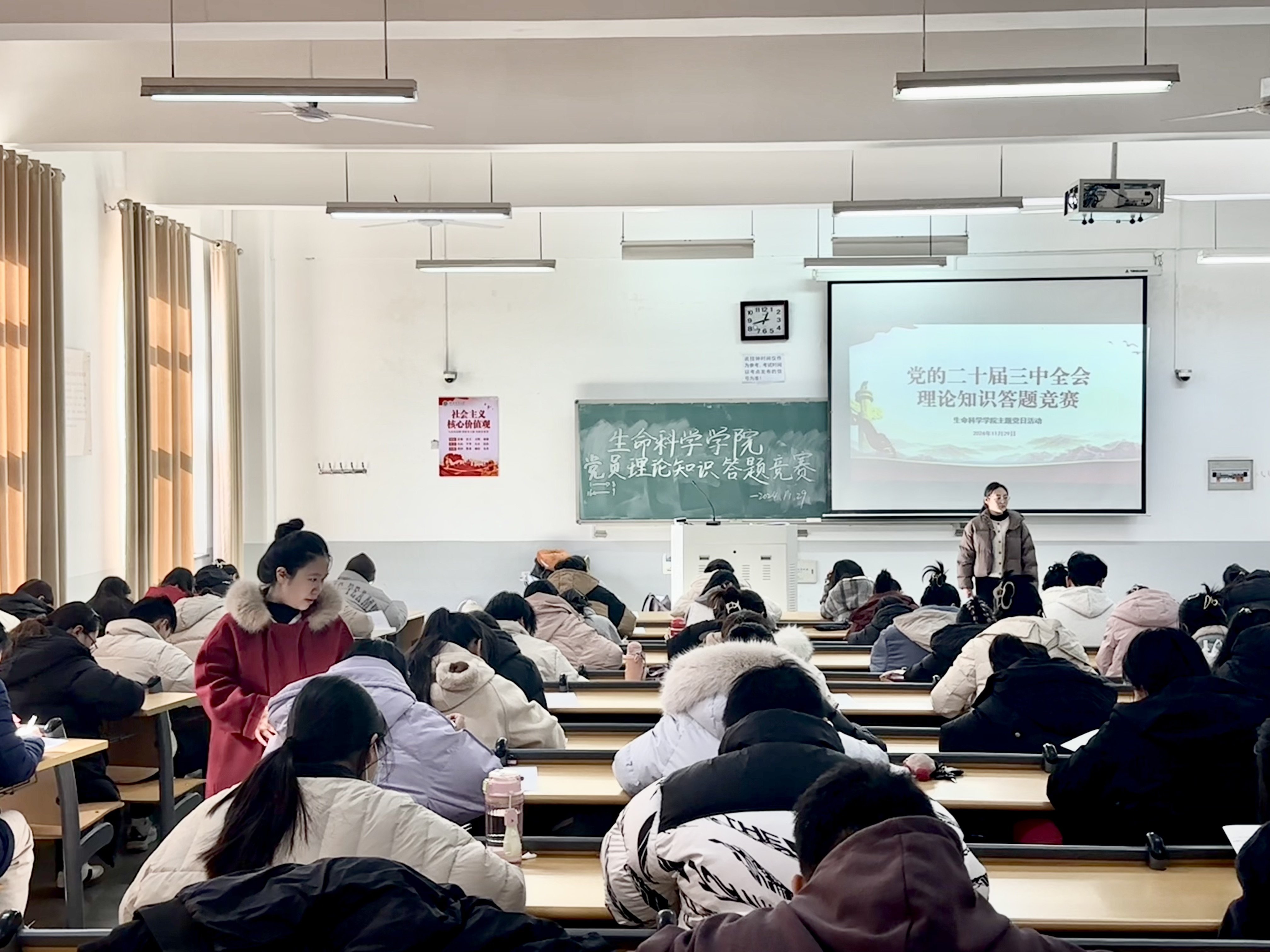 此次活动采取闭卷考试形式,由学院统一组织,题目覆盖了《中共中央关于进一步全面深化改革、推进中国式现代化的决定》《中国共产党纪律处分条例》等党的创新理论知识,重点考察了二十届三中全会提出的进一步全面深化改革的总目标、必须贯彻好六条重大原则、七个“聚焦”等内容。本次活动由院党委副书记张世昌、学生党支部书记共同监考,百余名研究生党员及本科生党员积极参与此次答题竞赛。答题期间,党员们认真审题,仔细作答,在短时间内出色地完成答卷,体现出较强的理论水平和综合素质。
