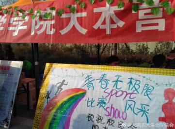 宣传部画了一个展板,做了一个英雄和五个条幅。在校运会的三天时间内,宣传进行有关运动会微博的更新,收集并整理各班上交的加油词,同时小蓝视频