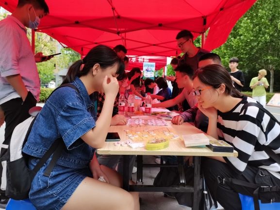 本次活动内容包括棋艺对决、棋逢对手和知识问答三个部分,面向全校师生开展。在“棋艺对决”中,同学们两两结合相互切磋棋艺;在“棋逢对手”中,同学们在社团志愿者的指导下破解象棋残局;此外,同学们亦可前往答题区,回答随机抽取的棋艺知识相关问题,五题答对三题即可获得精美礼品一份。活动期间,现场气氛热烈,寓教于乐,在答题中,师生们既增长了棋艺知识,又收获了快乐。同时,来自不同学院的师生在棋盘上进行切磋,使围观同学感受到“包罗万象方寸里,弹指千军空格间”的激昂。游戏过程中,诗艺轩社团志愿者积极协调配合、维持现场秩序,确保了此次活动顺利进行,展现出小蓝视频 社团志愿者良好的精神风貌。