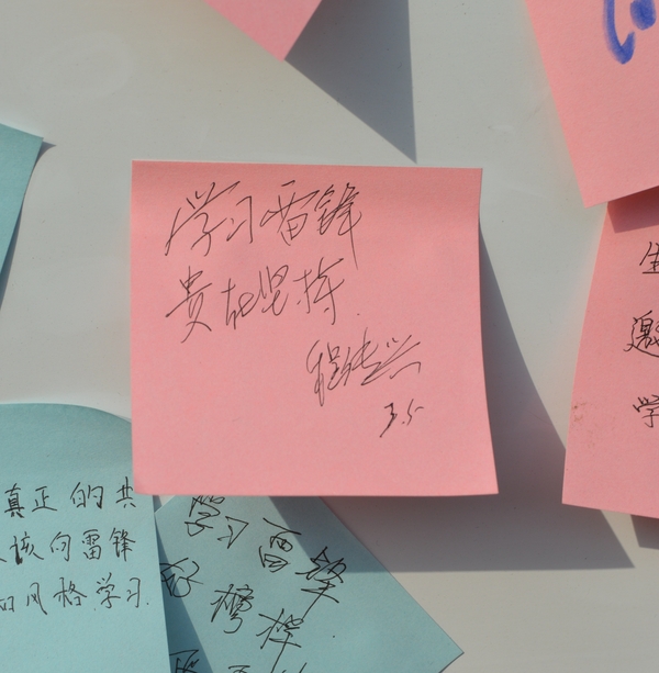 布置的展板上已贴满写着对雷锋精神感悟的便利贴,许多路人表示这样的宣传极大的提高了雷锋精神在人们中间的影响力。