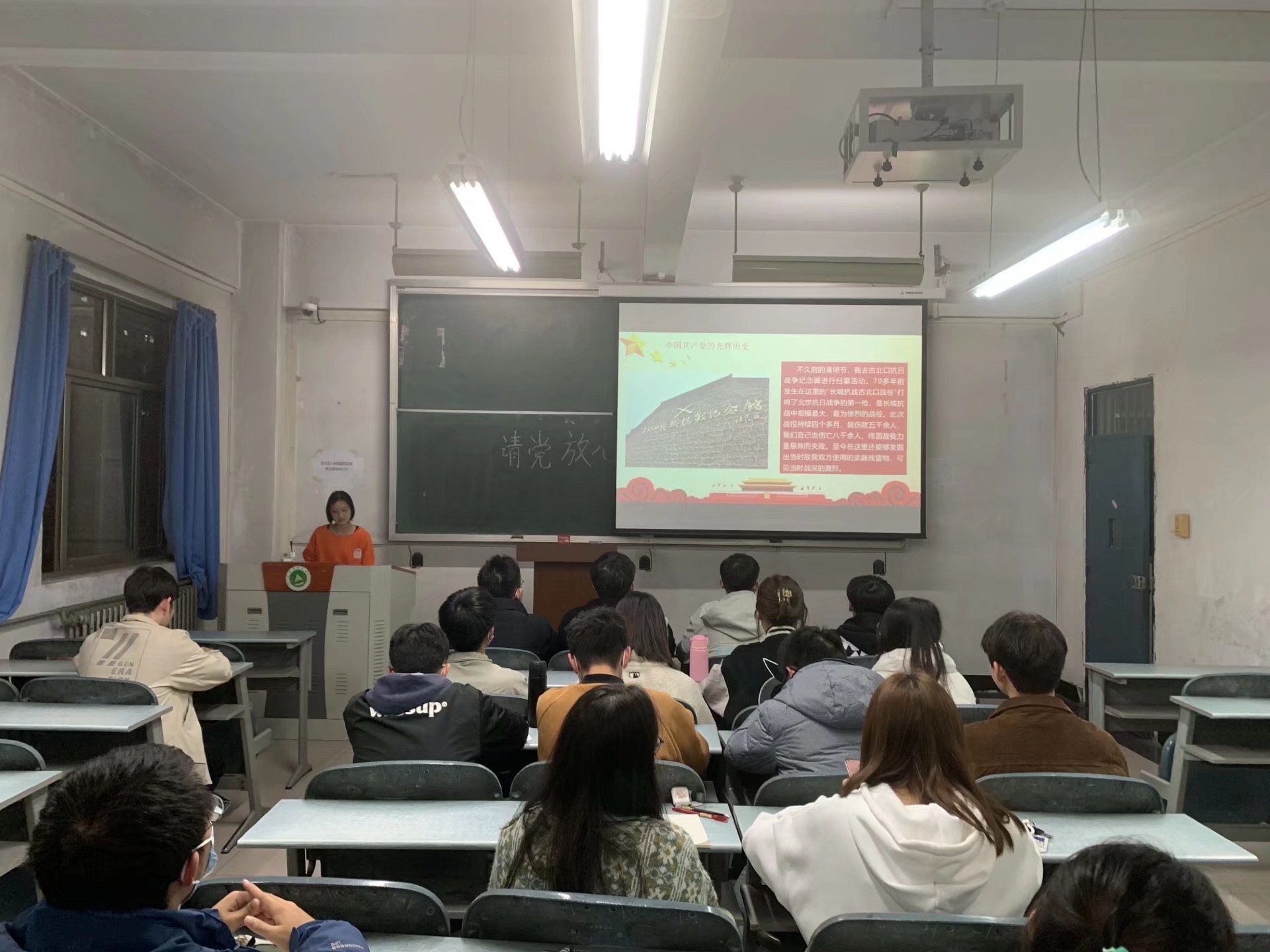 赵航首先向与会成员传达了此次活动通知及相关文件精神。活动围绕讲述家乡红色故事展开,班级成员分为五组,各小组代表依次上台结合PPT和视频进行展示。一组代表郭林峰讲述了《百年党史--三大战役》,二组代表刘倩倩概略讲述了中国共产党的光辉历史;三组代表李昊喆结合抗战视频分享故事;四组代表赵航从党的红色革命史、红色故事、红色歌曲以及红色诗词四个方面,讲述那些年党的奋斗记忆;五组代表樊鹏飞和魏琪讲述了中国共产党奋斗百年红色党史。活动最后,赵航在活动总结中表示,活动开展过程中大家表现积极,演讲内容扣人心弦、启发深思,活动起到了深化青马班成员党史学习的重要作用。