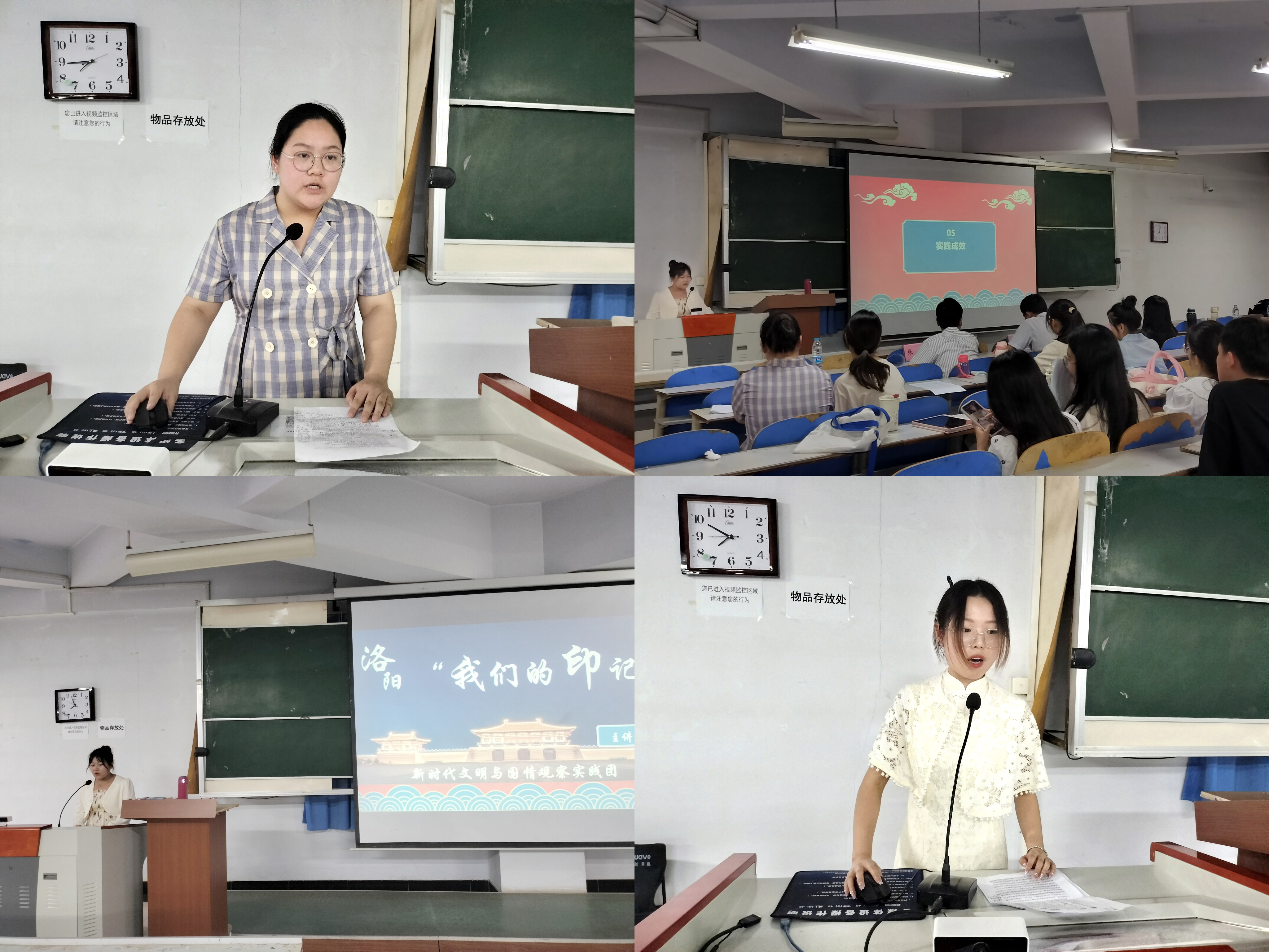 会上,13个实践团队讲解员通过PPT展示和口述的方式向同学们分享了精彩纷呈的社会实践故事,展现出各团队开展的党史学习、理论宣讲、志愿服务、国情观察、环境保护等各具特色的社会实践项目,并鼓励22级同学们知行合一,学会“自找苦吃”,赢得了同学们阵阵热烈的掌声。随后,张琨对小蓝视频 社会实践团队给予充分肯定并鼓励广大青年积极投身社会实践,为社会作出自己的贡献;陈子璇提醒同学们注重实践数据记录,将实践内容与论文紧密结合。大会最后,刘展对本次会议作出总结,强调同学们应在提升实践内容专业性的同时融入个人思考与创新,并鼓励2022级同学积极进行社会实践,在实践中不断成长。