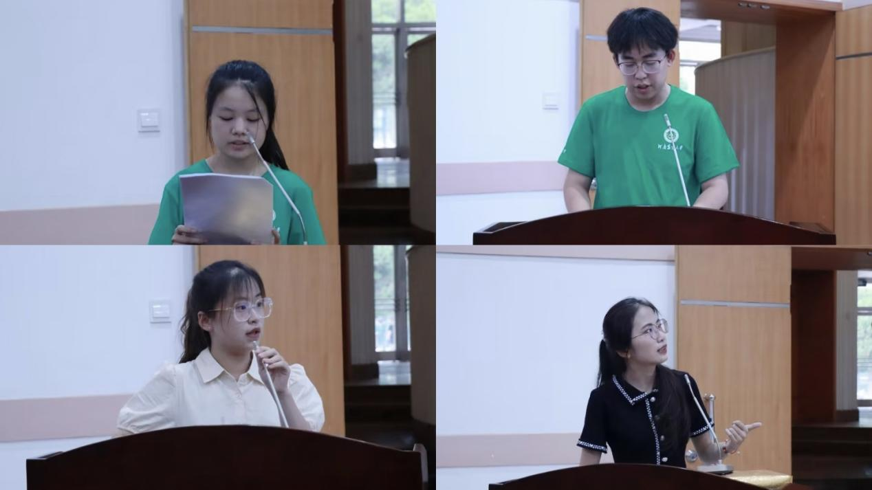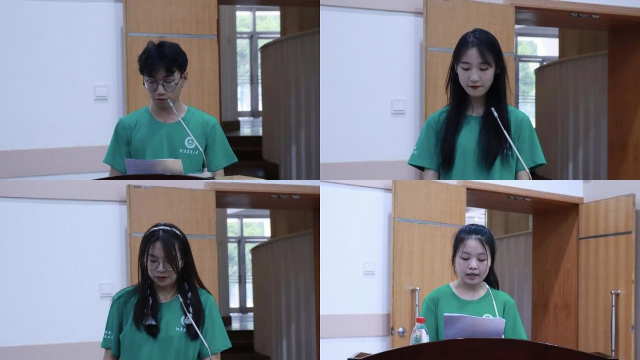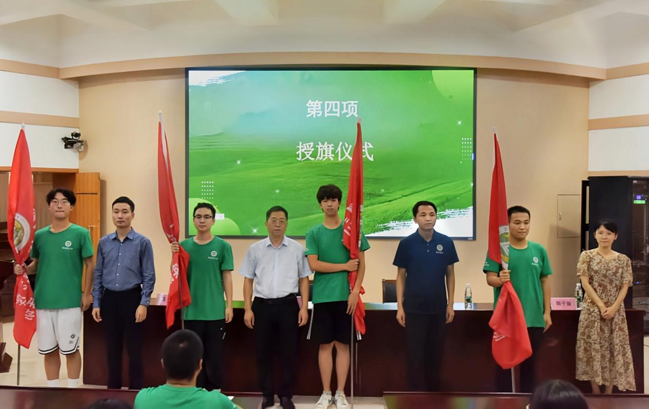 名单公布完毕,主席台众领导老师为2023年校级、院级社会实践重点团队负责人分别授旗并合影留念。随后,院团委社工部委员杨剑波上台讲解暑期社会实践内容及注意事项,2022年校级社会实践优秀个人代表李奕蒙、闫文亭上台分享往年社会实践经历经验,五位校级团队代表依次介绍带队项目。