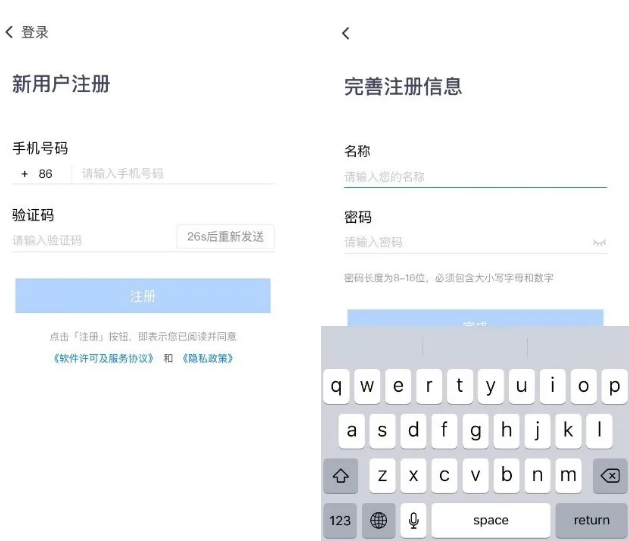 使用手机号获取验证码进行登录;完善注册信息