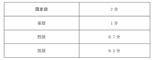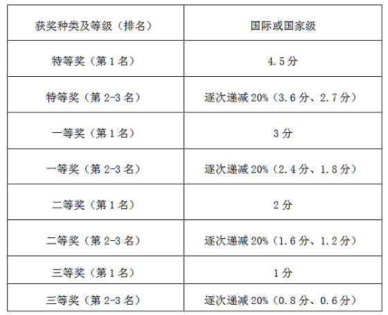注:①各项权威科研类赛事须经专家组审核认定,限与生物学专业相关的权威科研类竞赛(如生命科学竞赛等)和由学院牵头指导的学科类创新创业竞赛(如挑战杯、创青春、互联网+等);②国家三等奖及以上获奖计分,优秀奖不计分;③该奖项如无特等奖,则依次往前类推;④前3名参与者(含主持人)计分,其余参与者不计分。