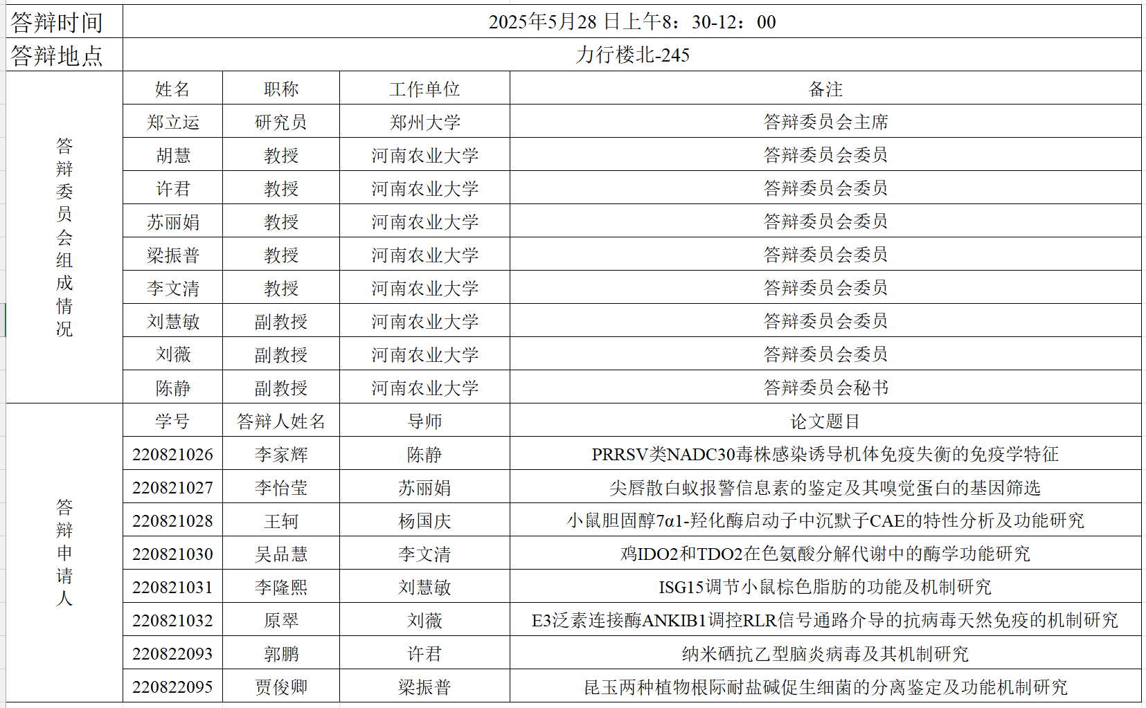 2025年上半年动物学硕士研究生毕业答辩公告
