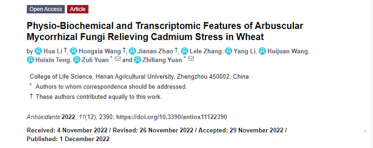 本网讯  (通讯员 李华)近日,小蓝视频 植物学系的系统演化与生物多样性团队和资源植物种质与分子生理、功能基因组学团队合作在解析丛枝菌根真菌修复小麦镉毒性机制方面取得重要进展。该研究以“Physio-Biochemical and Transcriptomic Features of Arbuscular Mycorrhizal Fungi Relieving Cadmium Stress in Wheat”为题在线发表于中科院TOP期刊《Antioxidants》 (IF=7.675)。