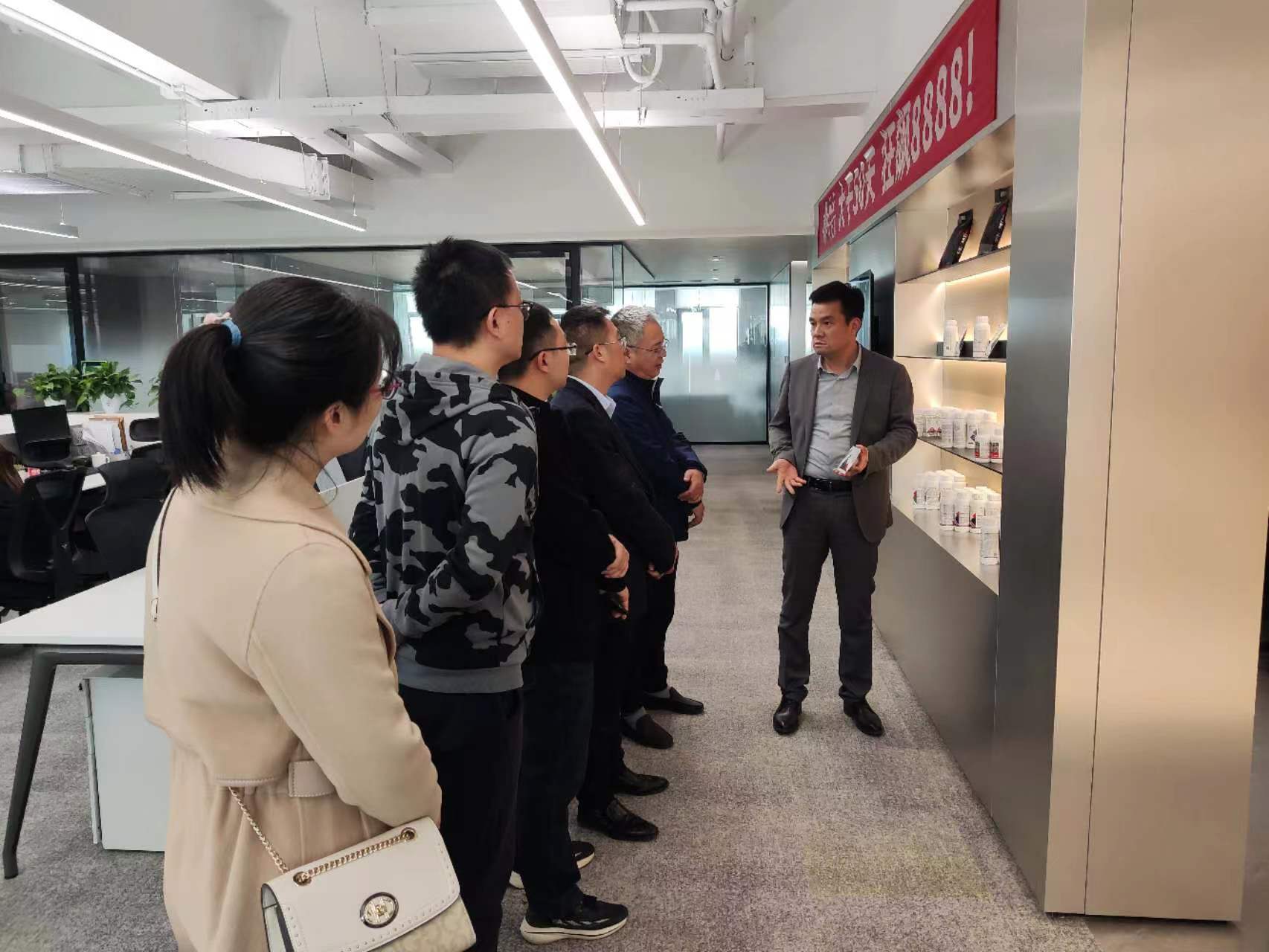 会前,陈诺带领大家参观了六夫丁公司的办公区域、实验数据室、荣誉展示区、产品展示中心、创意中心、党建室、洽谈室等区域。