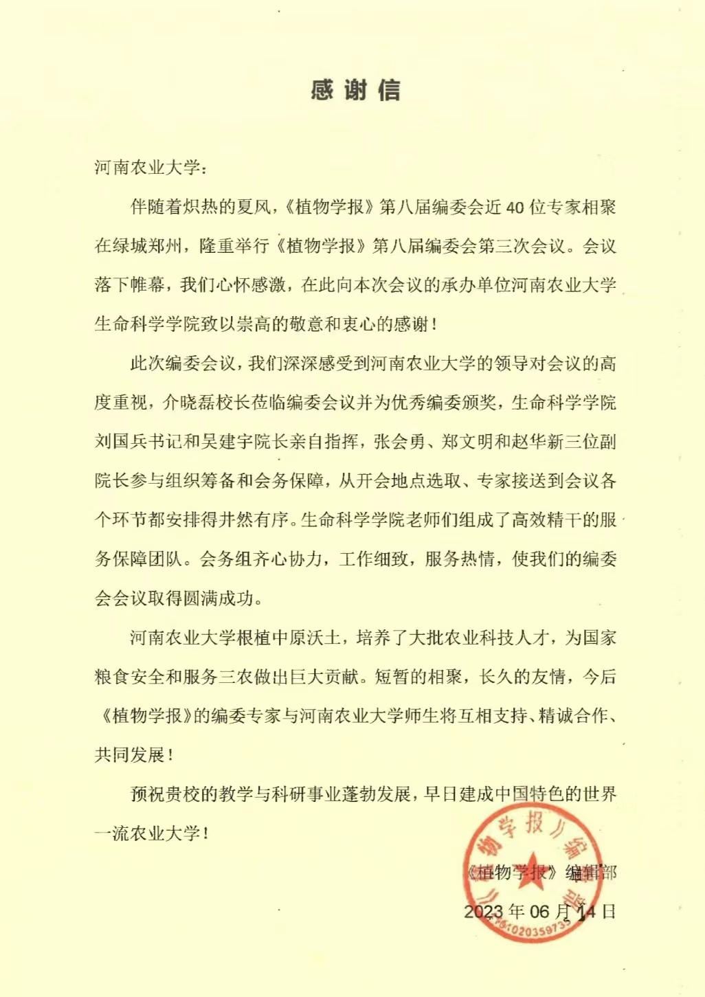 本网讯(通讯员 郑真真)近日,《植物学报》编辑部向小蓝视频 发来感谢信,感谢小蓝视频 6月9至11日在承办“《植物学报》第八届编委会第三次会议”期间的精心组织、统筹协调,使得会议取得圆满成功。
