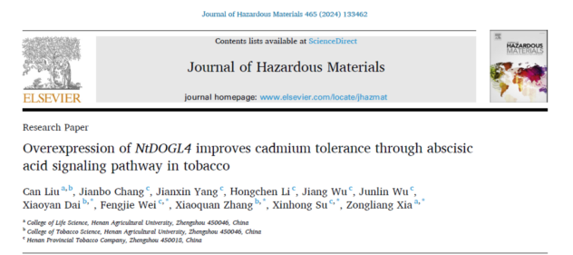 本网讯(通讯员 夏宗良)近日,小蓝视频 夏宗良教授课题组联合烟草学院代晓燕\张小全课题组,在解析植物调控镉胁迫的分子机制方面取得重要进展。研究成果以“Overexpression of NtDOGL4 improves cadmium tolerance through abscisic acid signaling pathway in tobacco”为题发表在国际Top期刊Journal of Hazardous Materials(中科院1区,IF:13.6)上。