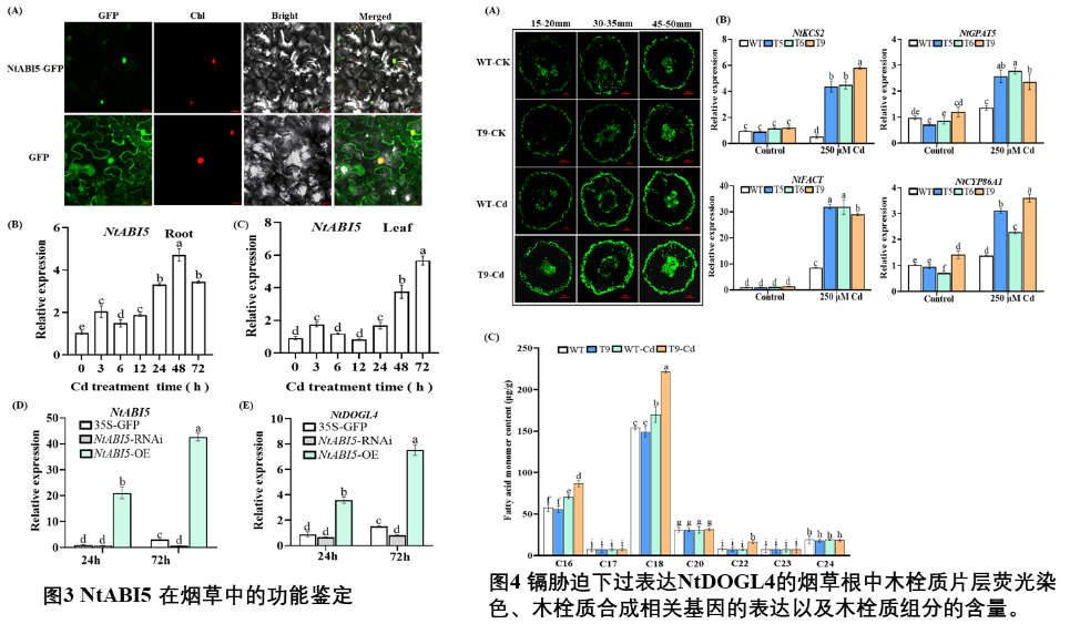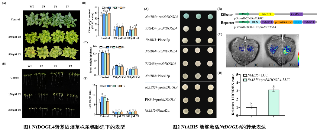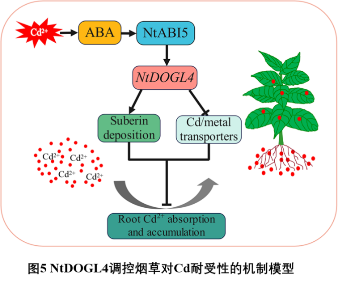 在先前研究中,我们通过转录组分析鉴定到一个响应镉胁迫的DOGL基因(NtDOGL4)。本研究利用转基因技术获得过表达NtDOGL4的烟草转基因材料,对该材料进行Cd胁迫处理,发现其内源性ABA水平升高,Cd积累减少和Cd耐受性增强,同时活性氧(ROS)积累减少。进一步,通过酵母单杂交、荧光素酶报告系统和瞬时表达实验,鉴定到一个调控NtDOGL4表达的上游转录因子ABSCISIC ACID-INSENSITIVE 5(ABI5),发现ABI5可以直接结合NtDOGL4的启动子,促进其表达。值得注意的是,NtDOGL4过表达促进烟草根部木栓质的形成和沉积,同时抑制烟草根中Cd转运基因的表达。综上所述,NtABI5-NtDOGL4分子模块在烟草对Cd胁迫耐受性中起到了正调节作用,该研究为培育低Cd积累的作物新品种提供了重要的分子靶点和基因资源,在确保环境和农业生产安全方面具有潜在的应用价值。