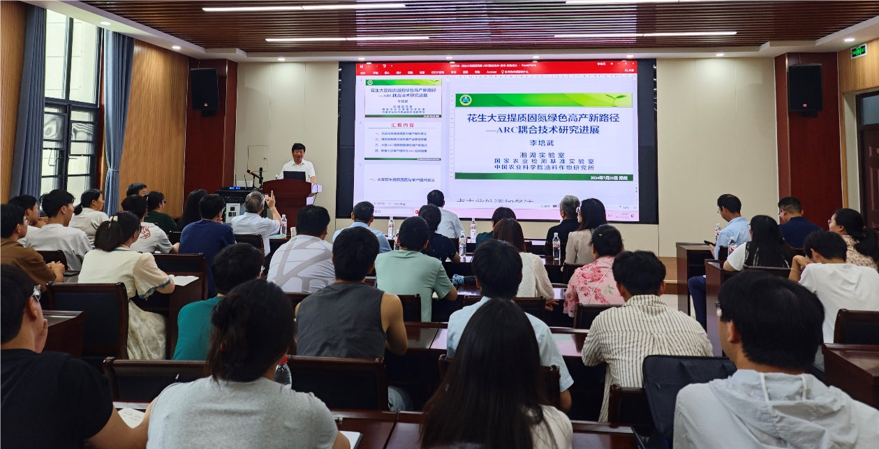 李培武院士以“花生大豆提质固氮绿色高产新路径——ARC耦合技术研究进展”为主题,深入浅出地介绍了花生大豆提质固氮绿色高产ARC耦合技术的研发历程及示范应用。李院士强调,该技术不仅打破了豆科作物共生固氮理论的现有认知,更以其“两固三增五减”的独特优势——即固氮、固碳、增产、增效、增安全、减毒、减损、减肥、减本、减碳,展现出了对推动我国粮油量质提升、保障国家农业产业高质量绿色低碳发展的重大价值。报告引起师生的强烈共鸣,现场气氛热烈,师生们纷纷就技术的细节、应用前景及未来研究方向向李院士提问。