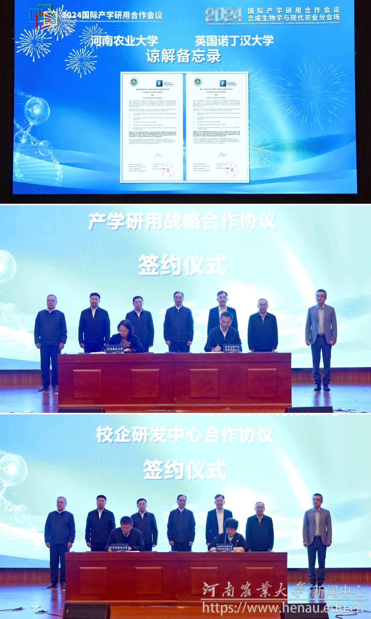 签约仪式上,学校与英国诺丁汉大学签署了谅解备忘录,与河南生物产业集团签署产学研用战略合作协议,并与河南中大恒源生物科技股份有限公司共建校企研发中心达成了合作协议。