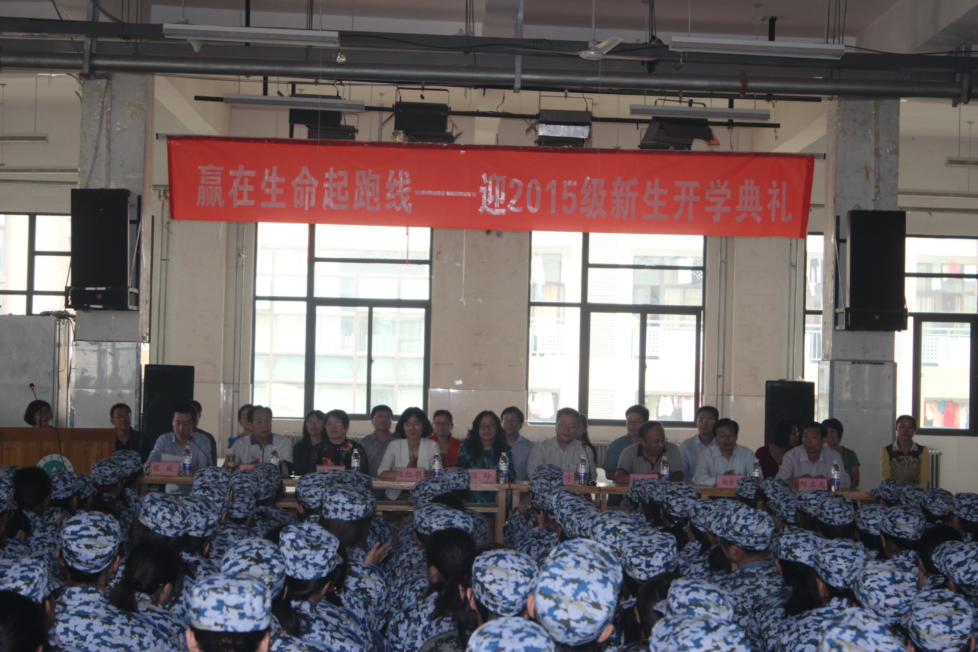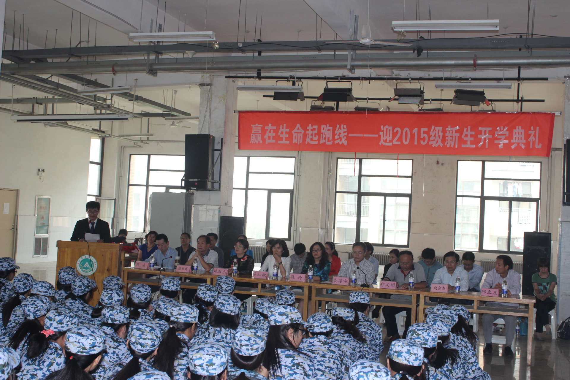 在龙子湖校区餐厅三楼大学生活动中心举办“赢在生命起跑线——迎2015级新生开学典礼”,院党委书记陈玲、院长吴建宇、副院长陈红歌、郑文明、刘淑杰,院团委书记程城,学院教师代表、新生班主任以及15级辅导员杜洋出席典礼,全体2015级新生参加此次大会,程城主持典礼。