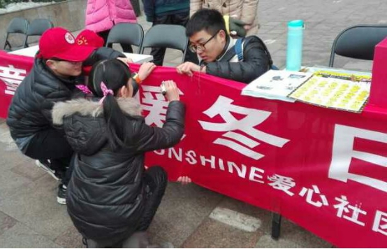 SUNSHINE阳光爱心社团的成员们在二七五里堡社区举办了“关爱儿童,情暖冬日”为主题的爱心募捐、爱心签名活动。此次活动旨在为寒冬里的留守儿童、孤儿及残障儿童汇集更多温暖。伴随着此次爱心募捐活动的开展,社团成员们为群众们积极宣讲,通过发送宣传页以及对于活动目的的介绍,使得群众们能够真正了解这些需要帮助的儿童并奉献出自己的一份爱心。并为奉献爱心的群众赠送爱心小徽章纪念品传递爱心。经过一上午的活动,社会各界人士热情的爱心捐献为这次活动划上了圆满的句号。凛冽的寒风冰冷了志愿者的脸庞,但想想贫困山区孩子们渴望的眼神,他们便无惧严寒,为爱而行。