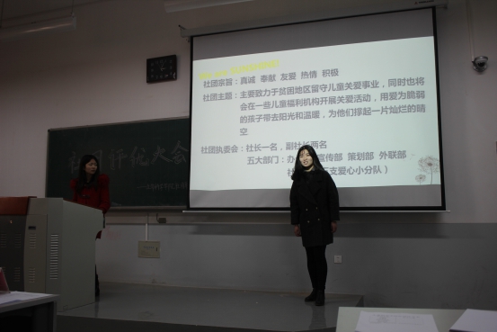 此次社团评优大会共有兰梅斋、生命志愿者协会、sunshine社团、viva la vida足球社、飞音社团、爱心家教社团六个社团参加评选。在评优大会上每个社团代表从自己所在的社团内部情况、社团活动及社团发展等几个方面做了精彩生动的介绍,使我们感受到了小蓝视频