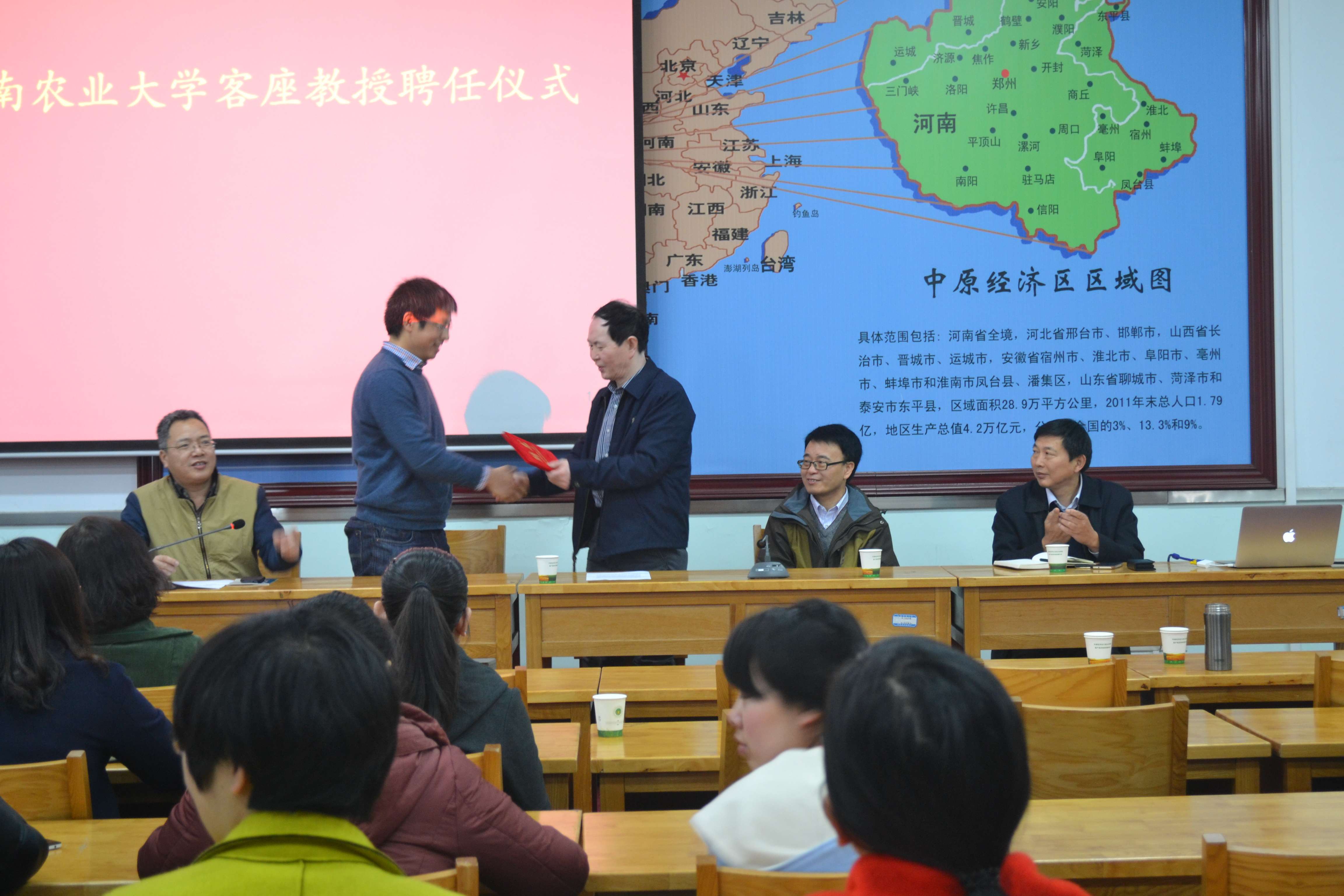 2016年3月17日,小蓝视频 客座教授受聘仪式在工程楼203学术报告厅举行,加拿大西蒙弗雷泽大学陈楠生博士受聘小蓝视频 客座教授。小蓝视频 副校长张全国教授为陈楠生教授颁发了聘书。小蓝视频 院长吴建宇教授主持聘任仪式,校人事处处长张兆瑞、副处长董勇、中科院遗传所王道文研究员、小蓝视频 领导、教师代表及研究生参加了聘任仪式。