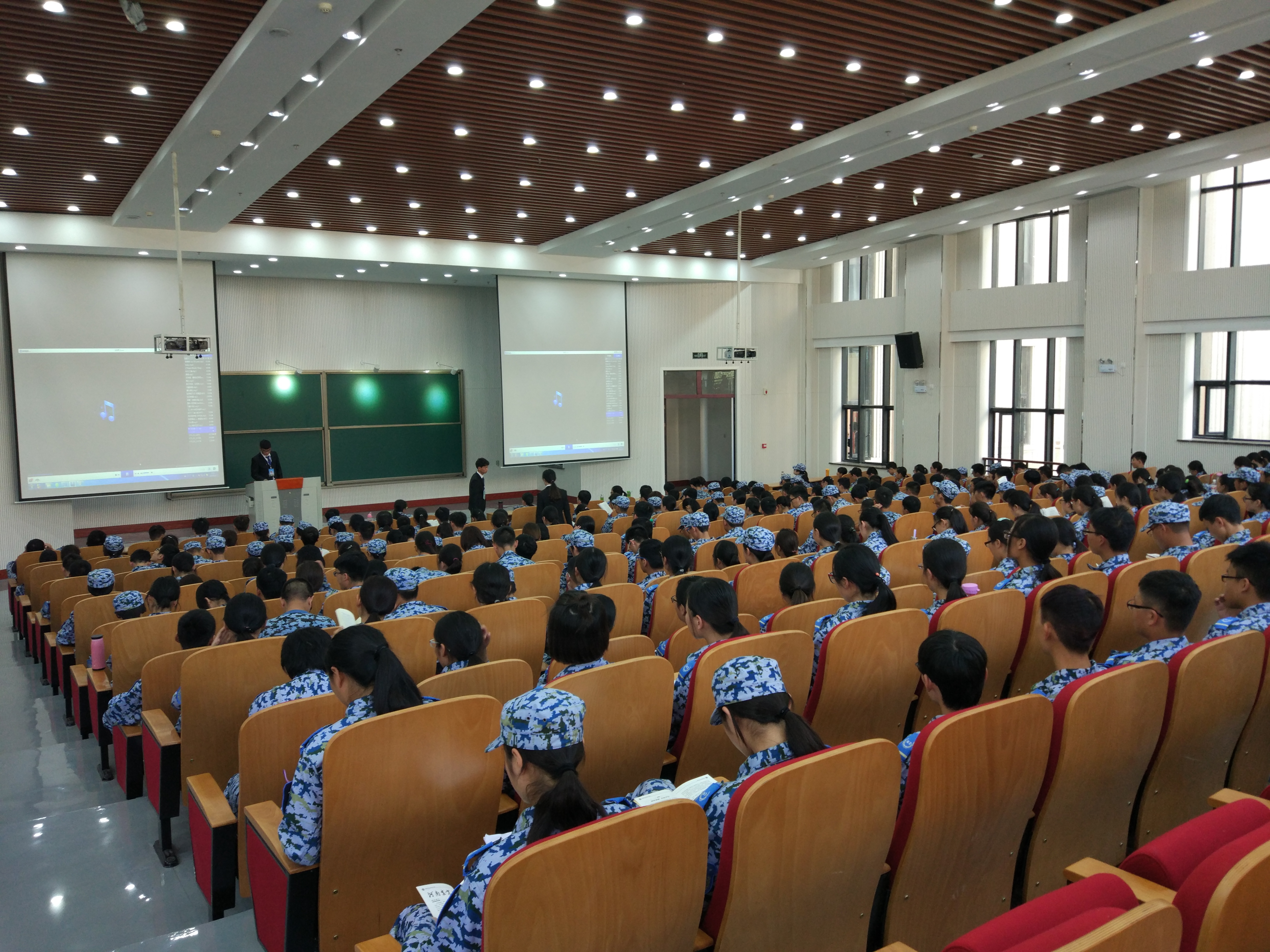 在龙子湖校区繁塔楼A座组织2016级新生进行校史学习,观看“沃土丰碑”小蓝视频
