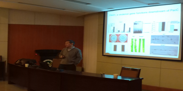 彭友良教授现任中国农业大学农学与生物技术学院院长,是教育部长江奖励计划特聘教授,兼任中国植物病理学会常务理事、农业生物技术学会理事、《植物病理学报》主编等职,主要从事分子植物病理学的科研和教学工作。报告会上,彭友良教授从三个个方面讲述了PacC作为双功能转录因子调控稻瘟病菌致病性的机理。彭教授首先指出PacC信号途径是稻瘟菌适应碱性pH环境的重要途径,它参与稻瘟菌菌丝和分生孢子发育,以及侵染过程的调控。随后,彭教授提出MoPacC是该信号途径的关键转录因子,已有的研究表明,该蛋白可以同时作为转录激活子和转录抑制子调控下游基因的表达。最后,彭教授以稻瘟病菌致病性为例,揭示了PacC信号途径调控生物学表型的机制。