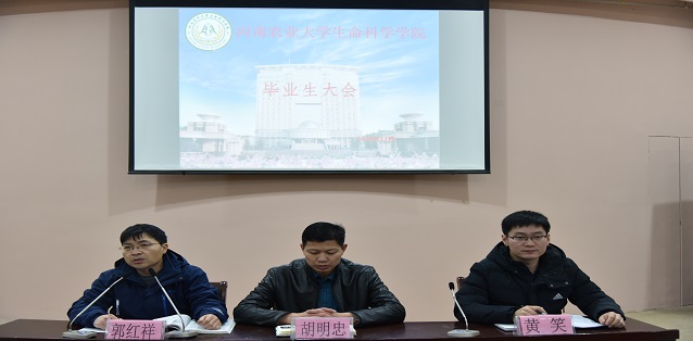 会议伊始,副院长郭红祥就教学工作从毕业实习、学业成绩和学院通知三方面给同学们进行了详细的讲解。向同学们强调了毕业实习对每位同学的重要性,提醒各位同学认真核对自己的学业成绩确保所选的课程符合本专业学分要求,同时要求每一位同学要时刻注意学院通知,使自己毕业前各项工作都能及时完成,顺利毕业。院党委副书记胡明忠对毕业生工作进行安排。首先就毕业清考,毕业论文等事宜向同学们进行了详细的说明。然后强调了安全意识的重要性,并从人身安全,财产安全,食宿安全,求职安全四方面做出提醒,要求每位同学都能保障自身安全、遵守校规校纪、遵守“923宿舍公约”,在毕业之际为自己的大学生活交出一份满意答卷。会议的最后院团委副书记黄笑对此次大会进行了总结,并就毕业生档案、毕业生就业及毕业生党员等相关问题做出了详细明确地解释说明,伴随着其对各位毕业生美好的祝愿以及各位毕业生的热烈掌声此次会议画上了圆满的句点。