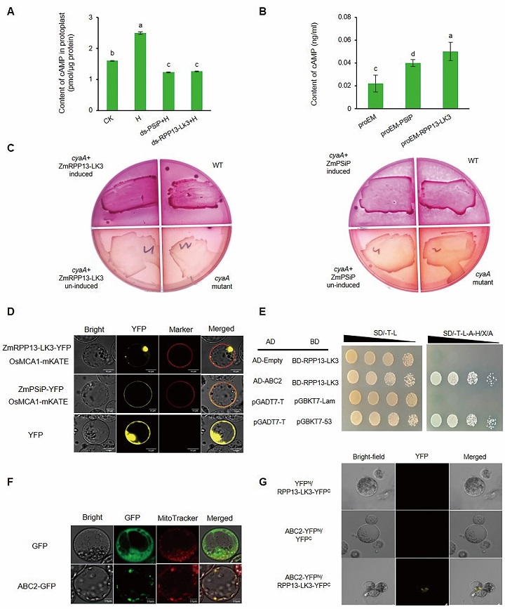 图1 ZmRPP13-LK3是一个新的腺苷酸环化酶并与ABC2互作