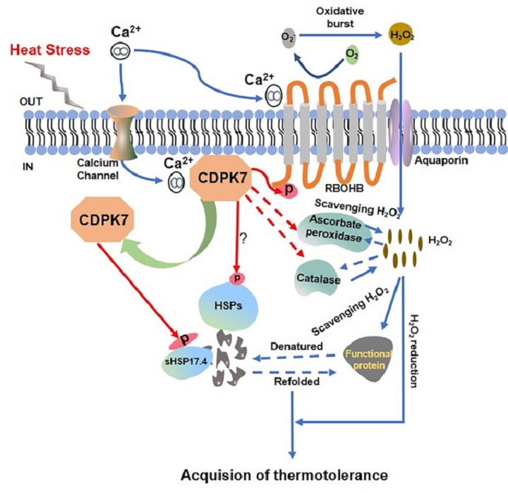胡秀丽课题组研究发现ZmCDPK7与ZmsHSP17.4存在相互作用,且磷酸化了sHSP17.4的Ser44位点和RBOHB的Ser99位点,并正调了这两个蛋白基因的表达。定点突变ZmsHSP17.4Ser44-Ala降低了高温胁迫下ZmCDPK7增加的玉米原生质体中的CAT活性,但增加了受ZmCDPK7抑制的MDA含量。ABA正调了高温诱导的sHSP17.4、ZmCDPK7和RBOHB表达。RBOHs抑制剂预处理显著降低了高温诱导的sHSP17.4和ZmCDPK7的表达。ZmCDPK7过表达、突变玉米株系分别显著增加、减低了玉米的耐热性。这些结果表明ZmCDPK7在依赖RBOHs产生的H2O2的上游和下游均起作用,并通过磷酸化sHSP17.4参与了ABA介导的玉米耐热性,sHSP17.4的磷酸化在其伴侣功能的发挥中起着重要的作用。研究结果为理解CDPK7耐高温机制奠定了基础,也为培育出耐高温玉米新品种提供了候选基因资源。