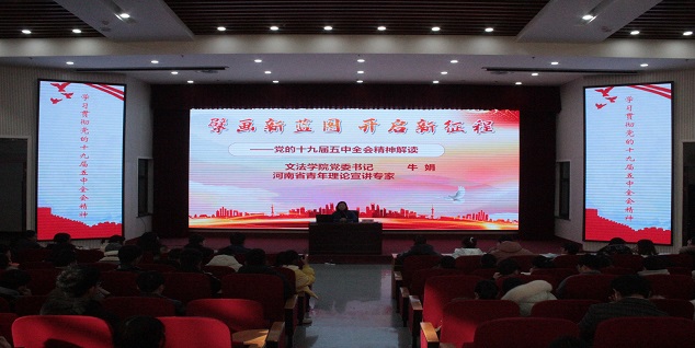 牛娟老师以“擘画新蓝图,开启新征程”为主题,首先以“两个百年奋斗目标”为切入点,结合实例,对党的十九届五中全会召开的背景和目的进行了全面解说,对开展全会的目的深入解说;牛娟老师从小蓝视频 于河南省的作用所在,引出在十九届五中全会后的关于国家发展的五个新表述,阐释了“国家四个全面战略布局”、“科技自立自强”、“全面推进乡村振兴”、“我国发展仍然处于重要战略机遇期”“在危机中育先机、于变局中开新局”的详细目标;最后以学生自身为例,号召在座学生牢记农大人的使命和情怀,深刻领会全会精神的科学内涵和精神实质,争做学习全会精神、宣传全会精神的示范者,谱写中国时代新篇章。