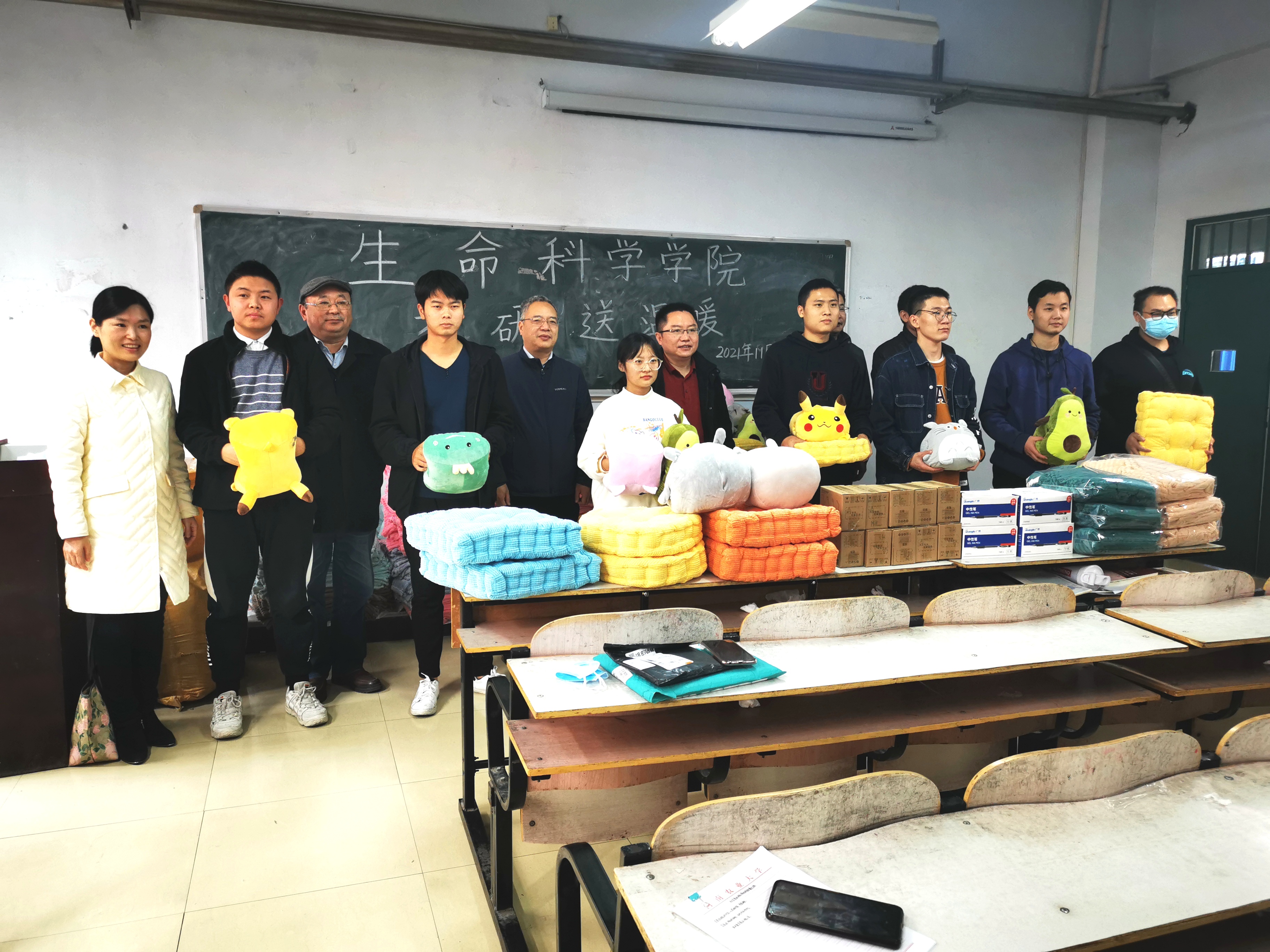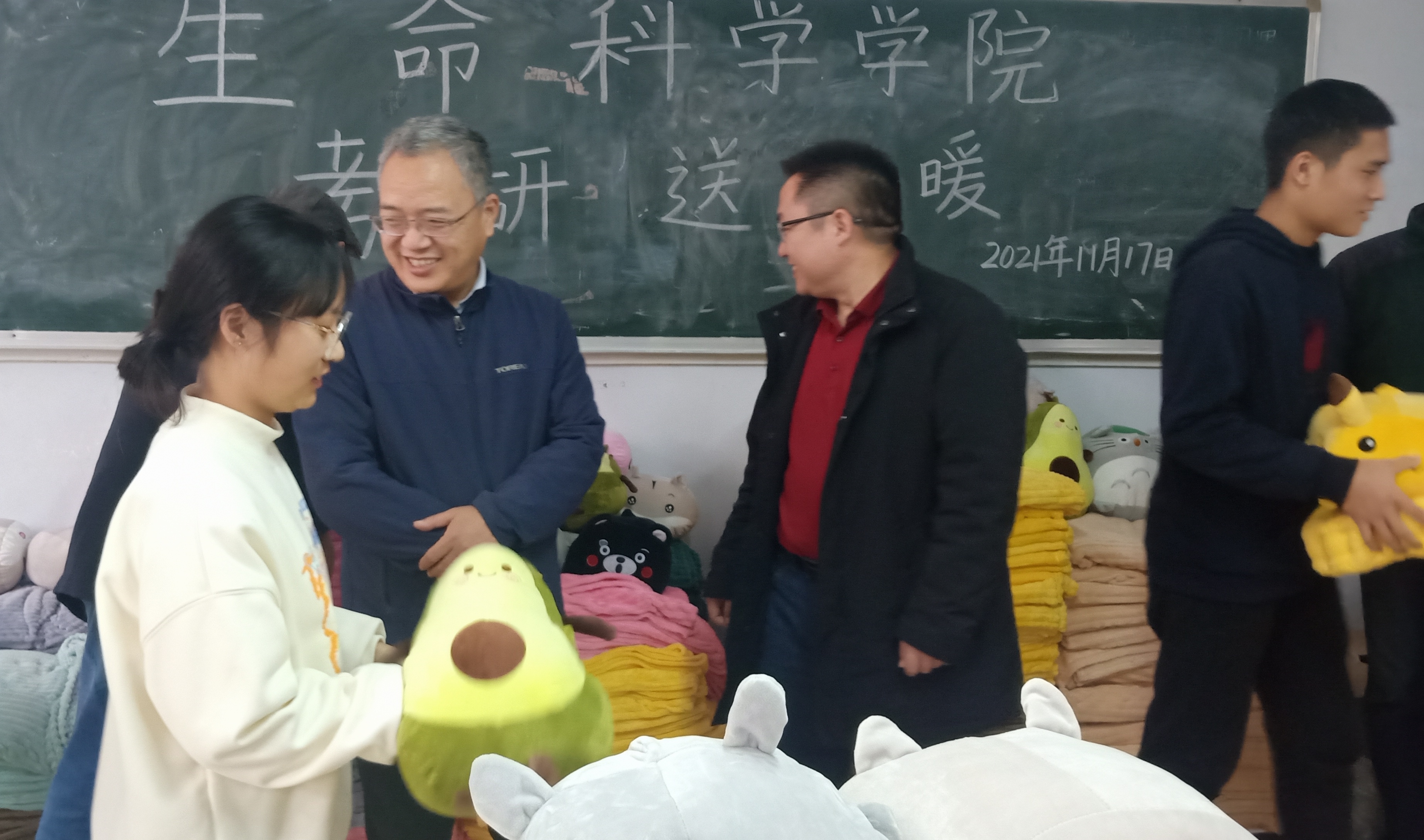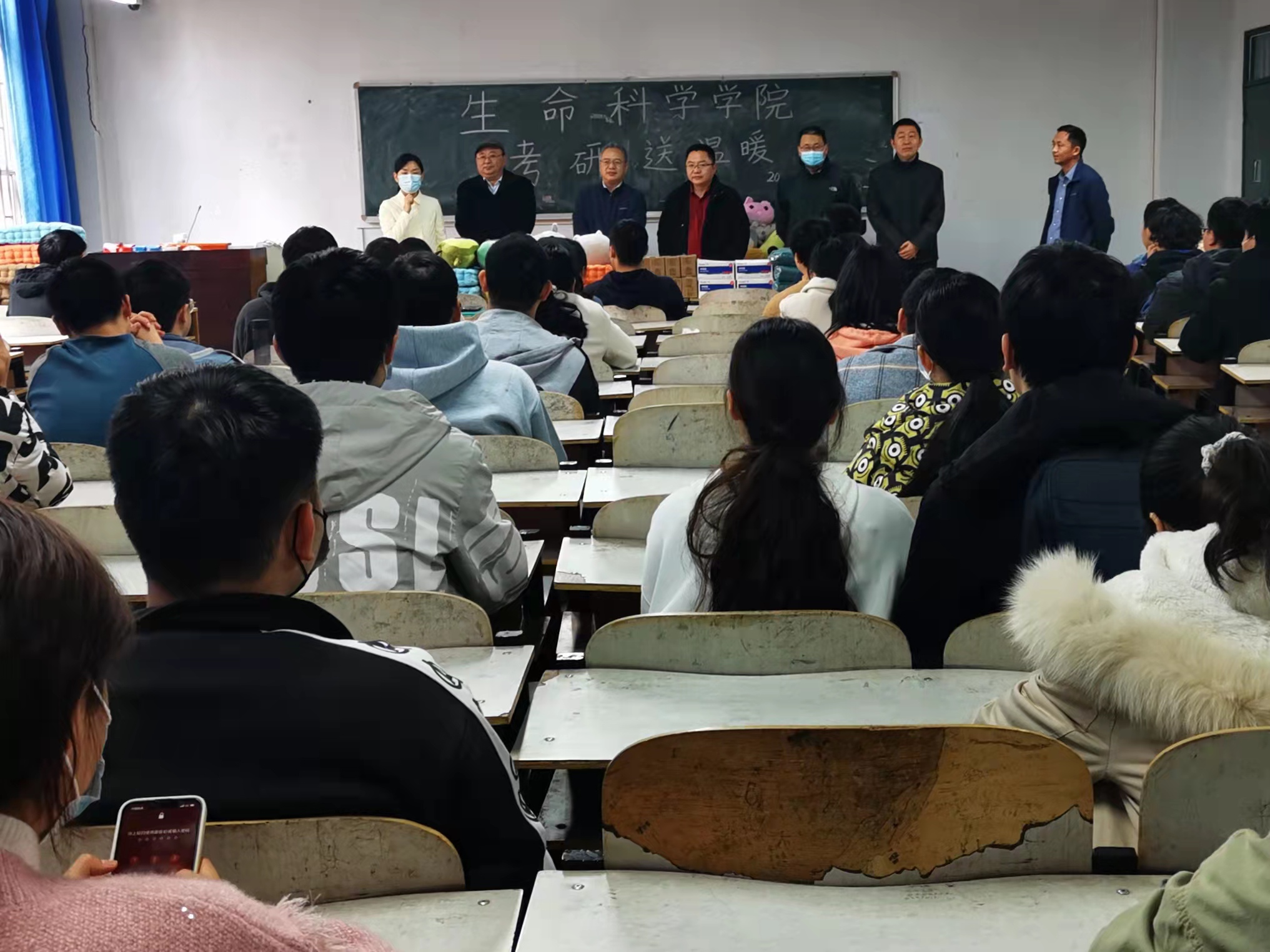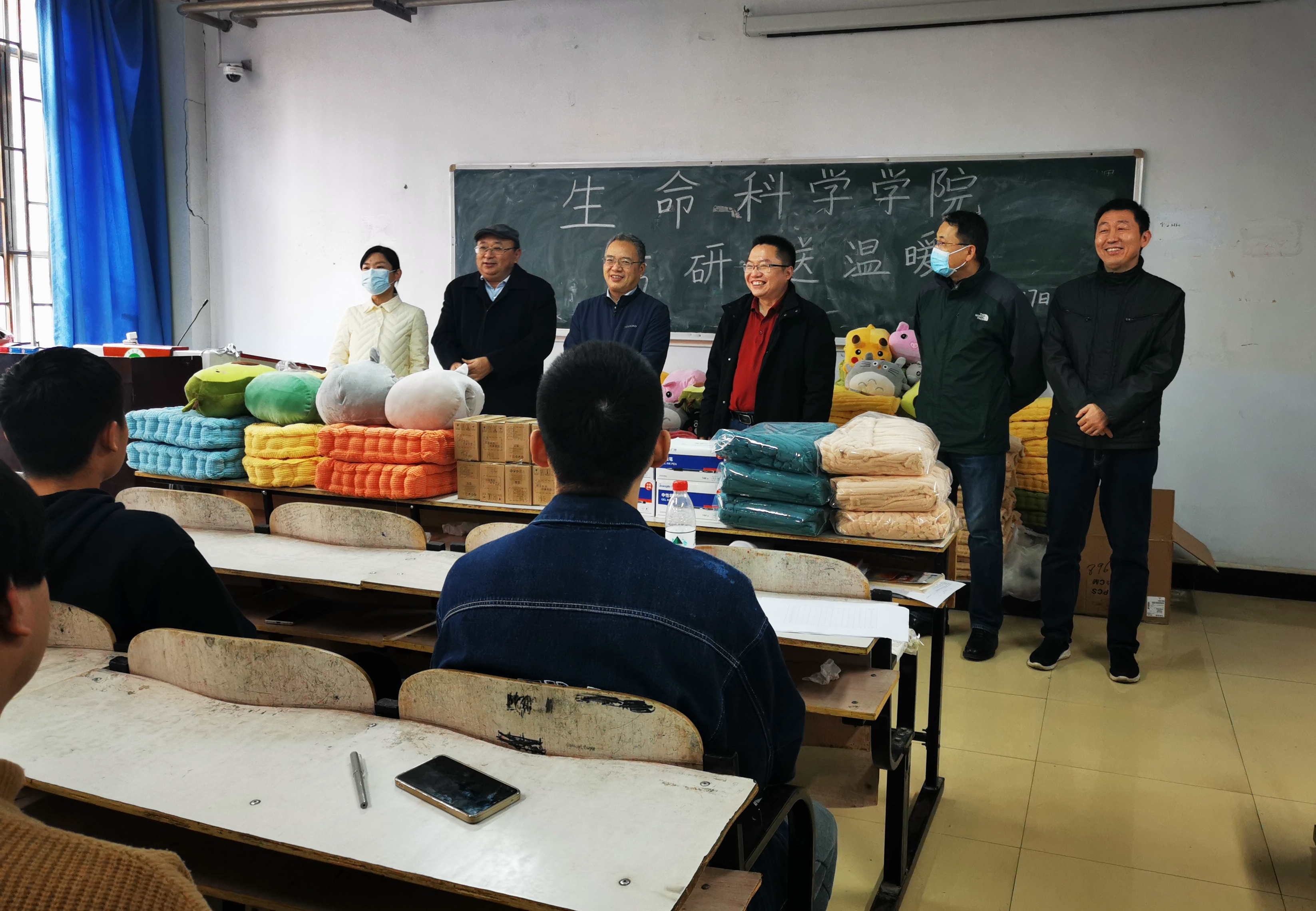 吴建宇向考研学生表达了慰问和关心,分析了毕业实习对考研面试的影响,要求大家在考研备考的同时重视毕业实习,与实习导师加强沟通。郑文明鼓励考研学生利用好学院的各种考研资源,多向专业前辈请教;临近考试,希望大家坚定信心、保证身体、准备冲刺。张会勇表示,全院老师一如既往、全力支持同学们考研,鼓励大家针对学业上的疑惑,积极主动向老师寻求帮助。陈明明为同学们鼓劲,希望大家正确看待考研竞争,发扬艰苦奋斗精神,不留遗憾。与同学们简短交流后,学院领导老师为各班同学发放温暖物资。此次活动物品包括毛毯、坐垫、抱枕、台灯等,同学们领到心仪的个性化物品,脸上洋溢着喜悦,表示将不负学院关怀,争分夺秒,将考研战斗进行到底。