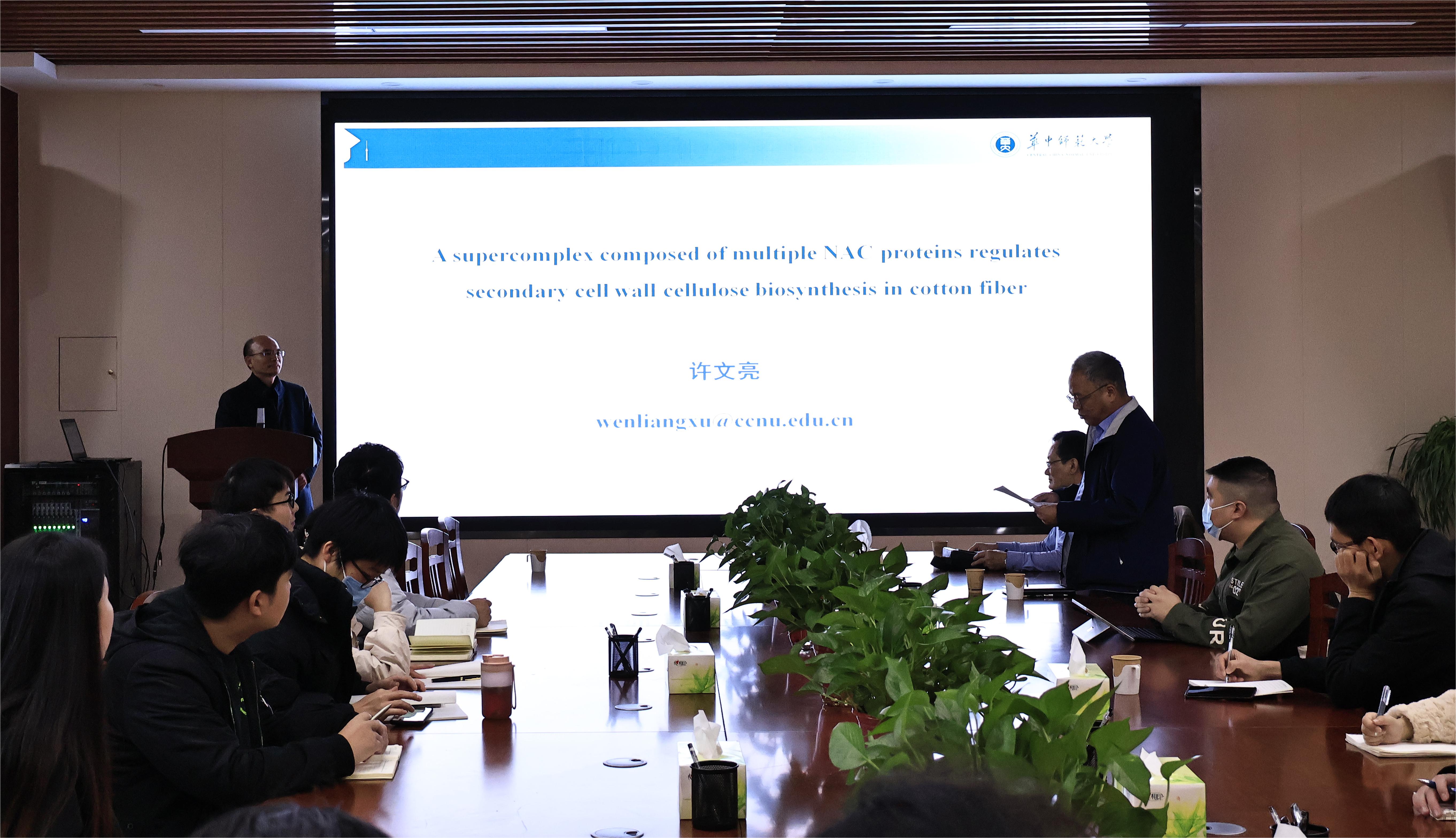 许文亮以《A supercomplex composed of multiple NAC proteins regulates secondary cell wall cellulose biosynthesis in cotton fiber》为题,从棉纤维在不同行业的重要性、其特殊的结构和组成等方面,深入介绍棉纤维发育机制的研究现状,重点阐述了NAC转录因子如何通过调控多个纤维素合酶(Ces)基因的表达,参与棉纤维细胞壁次生壁合成的分子调控网络。