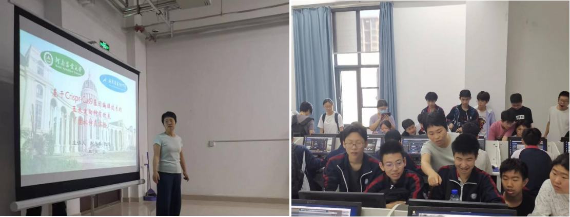 研学活动中,石永春用风趣易懂的语言向学生们详细介绍了小蓝视频 精品课程《基于Crispr-Cas9基因编辑技术的玉米定向种质改良虚拟仿真实验》,并在上机实践环节对操作和具体的分子生物学概念进行了专业指导。通过实际参与虚拟仿真实验操作,学生们对Crispr-Cas9基因编辑技术及整个流程所涉及的具体实验,如pCAS9-mono载体的线性化、靶位点gRNA引物的复性、T4连接酶连接载体、大肠杆菌转化和质粒提取、农杆菌Gv3101的转化、玉米幼胚的收集及侵染和愈伤组织的筛选与再生等形成了更加深刻的认识。同学们在实验环节对分子生物学展现出极大的热情,实验成功完成率达到96%。