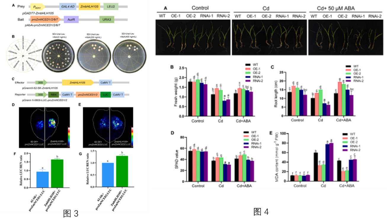 本研究通过利用过表达和RNAi bHLH105转基因玉米株系,探究bHLH105在镉胁迫响应中的作用。在玉米幼苗中,过表达ZmbHLH105基因可提高内源性ABA水平,减少Cd积累,并增强Cd胁迫耐受性(图1,2)。通过酵母单杂交和荧光素酶报告系统,证实ZmbHLH105直接结合于两个关键ABA生物合成基因ZmNCED1/2的启动子区域,激活其转录,从而提高ABA水平和Cd耐受性(图3)。而且,外源性ABA补充增加了Cd胁迫下玉米根部的木质素含量(图4),ZmbHLH105的过表达促进了木质素的合成,而ZmbHLH105-RNAi则减弱了这种效果(图5)。表明ZmbHLH105介导的Cd耐受性可能涉及ABA诱导的木质素沉积和细胞壁加厚。此外,ZmbHLH105过表达株系中与Cd运输相关的基因表达受到抑制。我们的研究表明,ZmbHLH105通过增强ABA生物合成、增加木质素沉积、加厚细胞壁和抑制Cd吸收来降低Cd积累,提高Cd耐受性(图6)。这项研究揭示了ZmbHLH105在Cd耐受性中的机制,突显了其在培育低Cd积累作物方面的潜力,对保障粮食和环境安全具有重要意义。