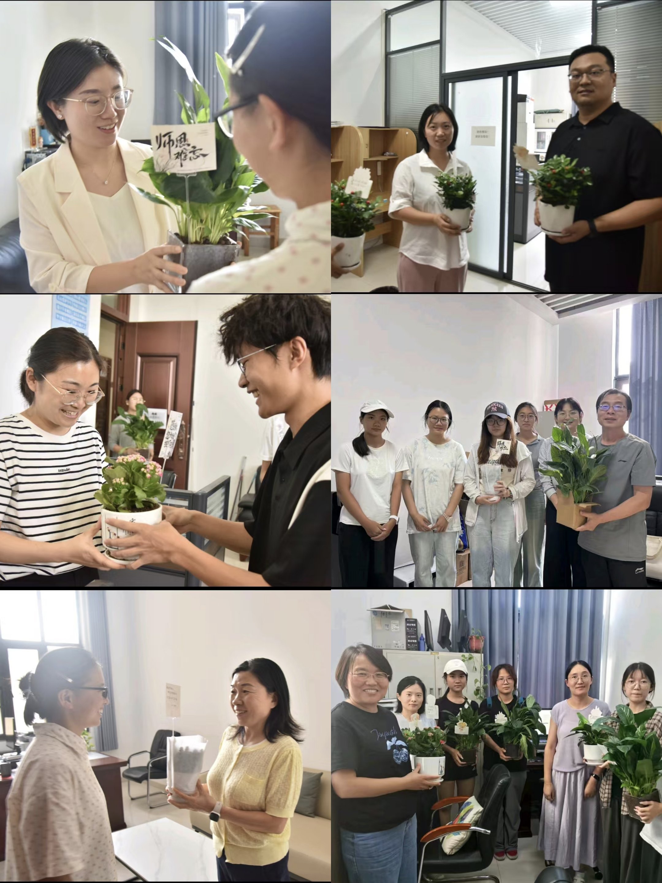 接着,学院各系工会组长带领学生代表前往各系老师办公室开展以“喜迎教师节,绿植映满院”为主题的教师节献花活动。学生们亲手将绿植和贺卡送至老师手中,并与老师亲切交流。