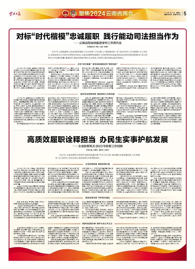 为推进行政检察实现有力监督,云南省检察机关采取生效裁判案件备案和一体化研究等措施,进一步加强行政诉讼监督,受理审查行政检察监督案件5531件。同时,还出台了开展行政违法行为监督工作指引,对履行法律监督职责中发现的行政机关违法行使或不行使职权行为,发出检察建议2706件,并支持配合解决问题,有效推动依法行政。